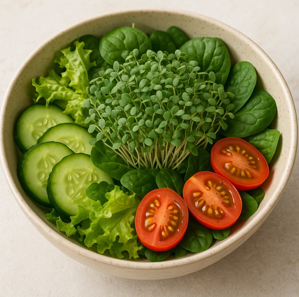 Packed with fiber, antioxidants, and plant-based omega-3s, this chia microgreens salad bowl delivers a powerhouse of nutrients—featuring hydrating cucumber, iron-rich spinach, and vitamin-loaded cherry tomatoes for a clean, energizing meal.